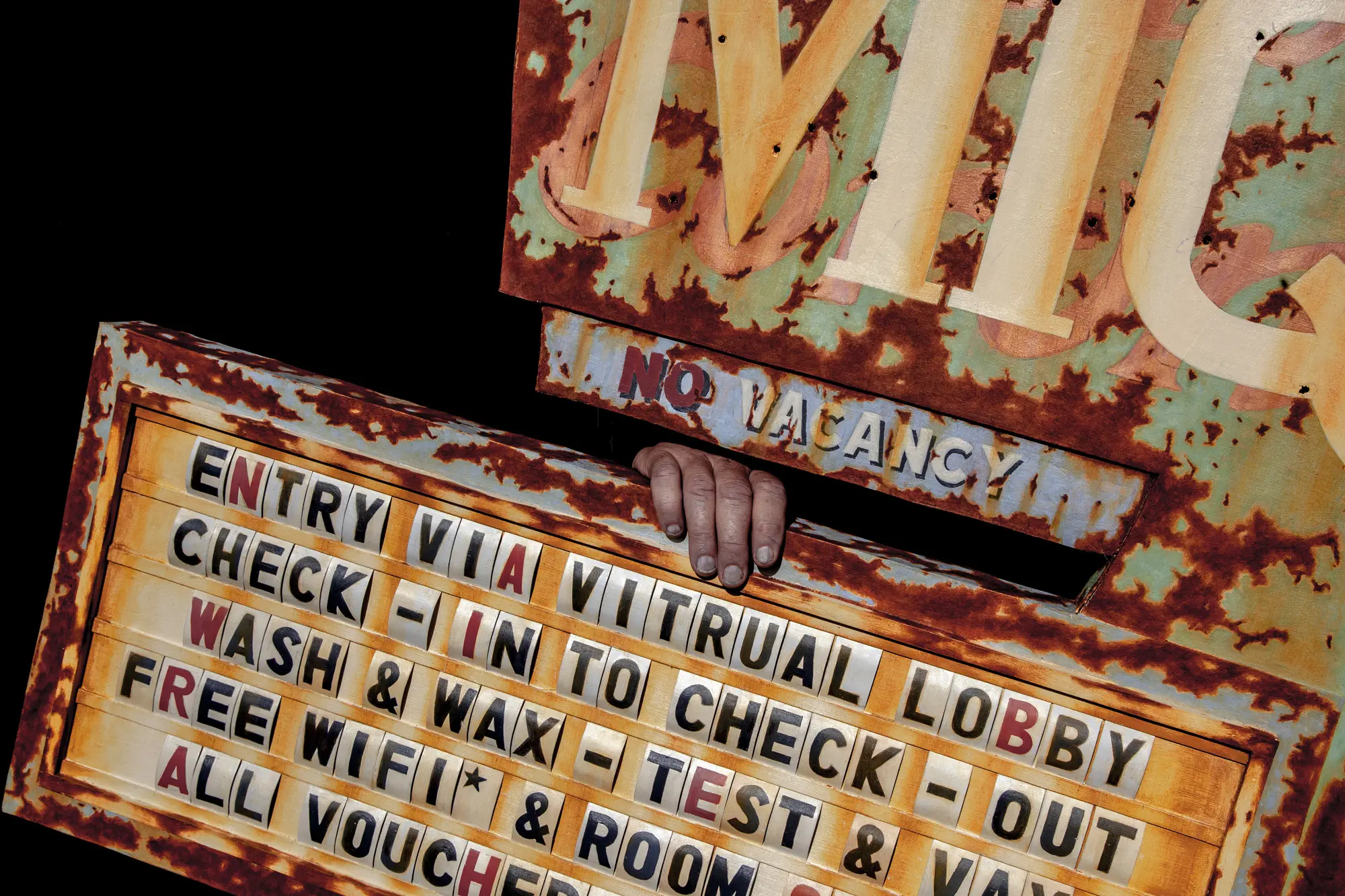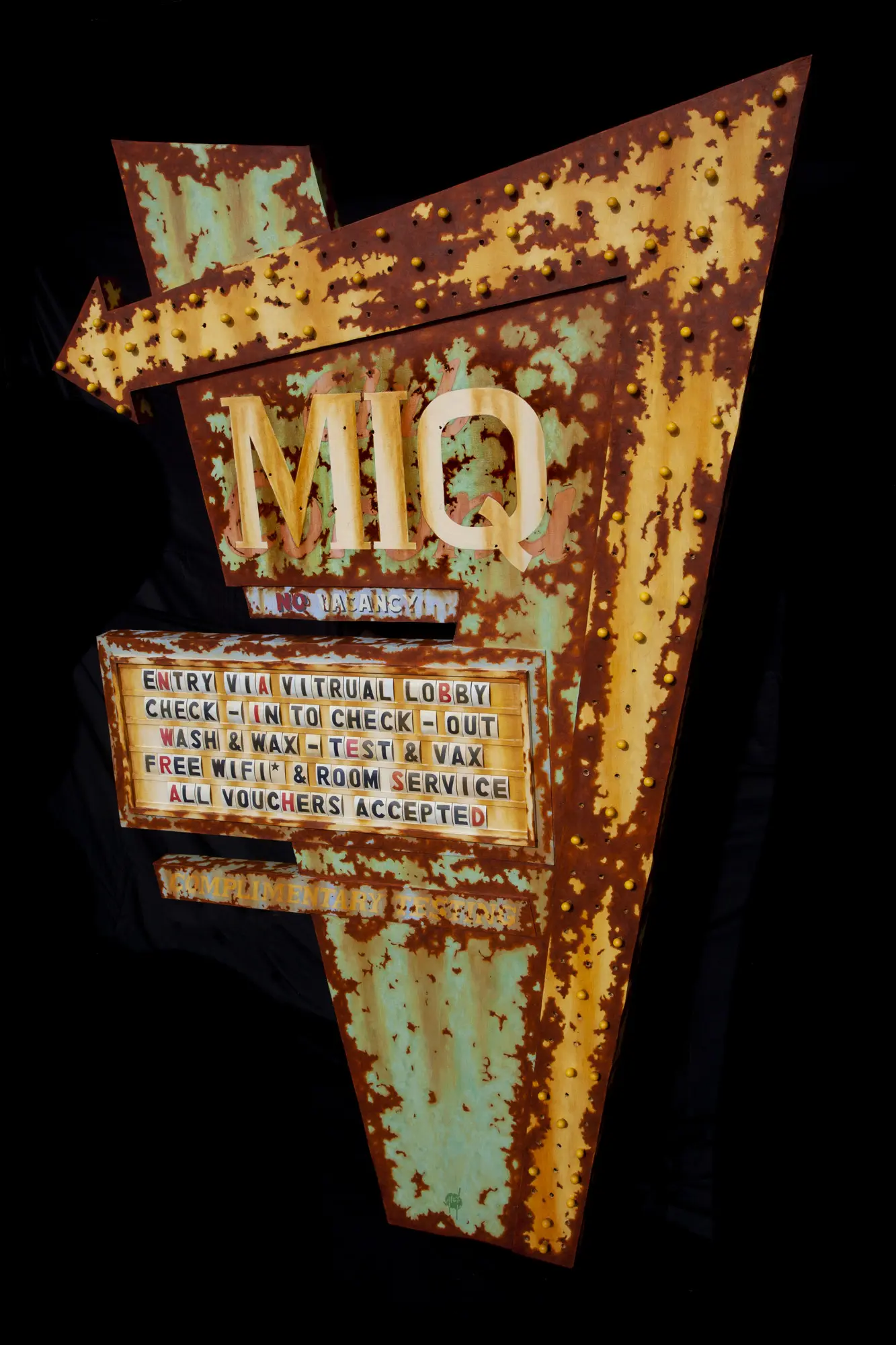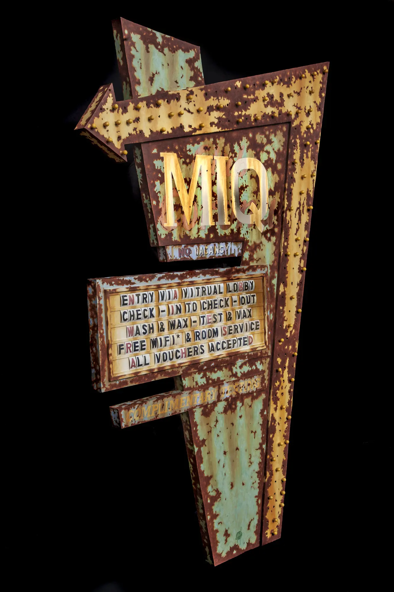 “M.I.Q” interrogates the architecture of control disguised as care. The rusted motel sign—once a symbol of freedom and movement—becomes a relic of confinement, advertising a sterile promise: virtual lobbies, tests, vouchers, and no vacancy for humanity.