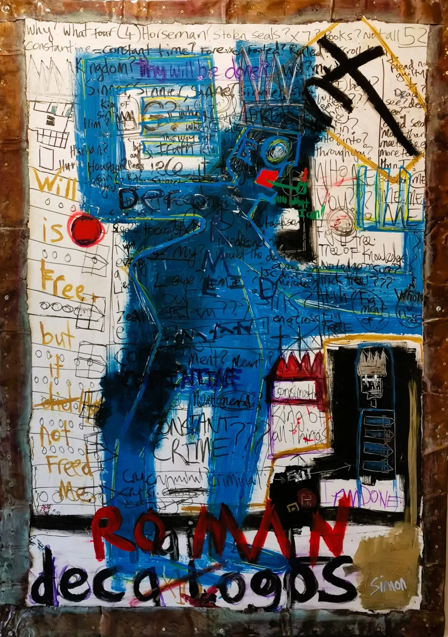 The work’s title references the Decalogue – the Ten Commandments – while the scrawled phrases and symbols, including a stark black cross and apocalyptic allusions, confront the tension between imposed order and individual freedom.