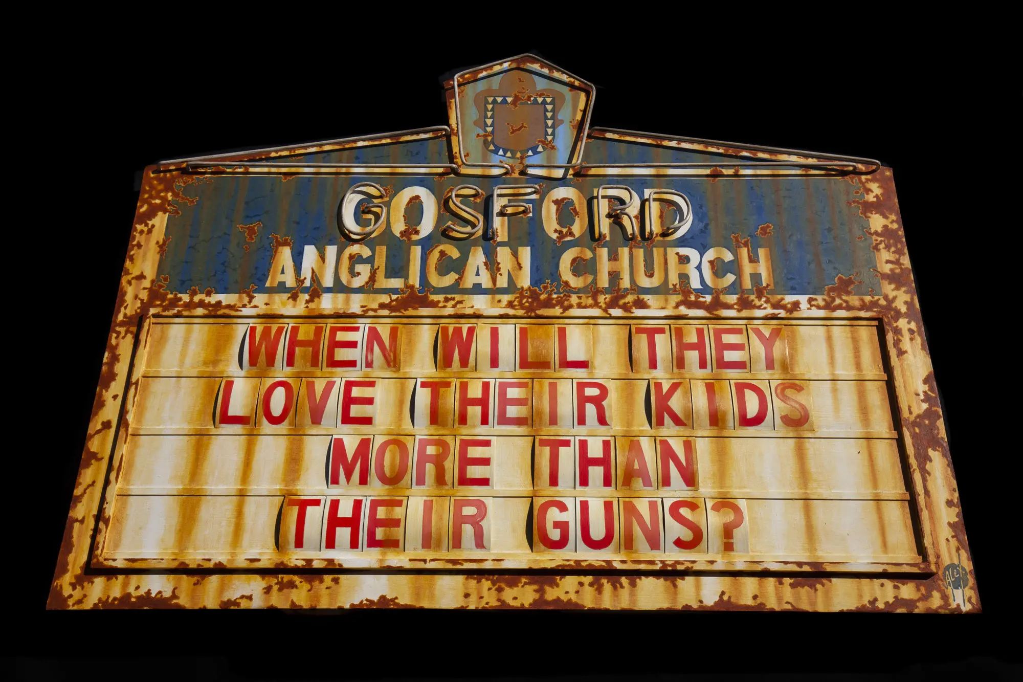 The intersection of faith, morality, and cultural violence through the lens of a weathered church sign – a symbol traditionally associated with community guidance and spiritual reflection, leaves a stark, urgent question that challenges the normalisation of gun culture and its devastating consequences.